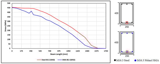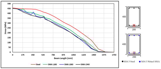 Stress of the beam reinforcement rebar using different lengths of SMA under monotonic pull loading versus the beam length at 8% drift.