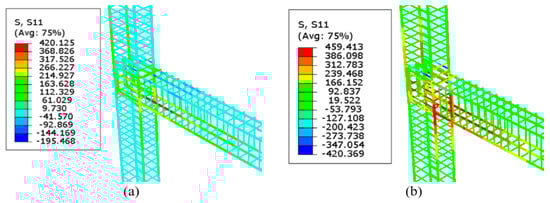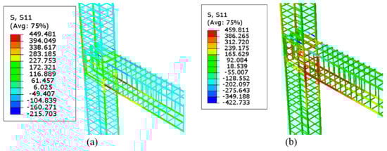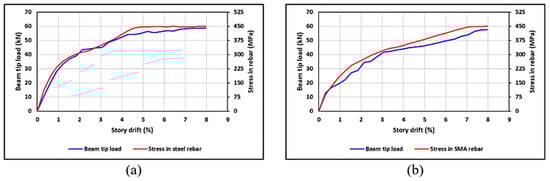 Stresses of steel and SMA rebars of S2N1 specimen during push loading at (a) 2.8% story drift and (b) 8% story drift.