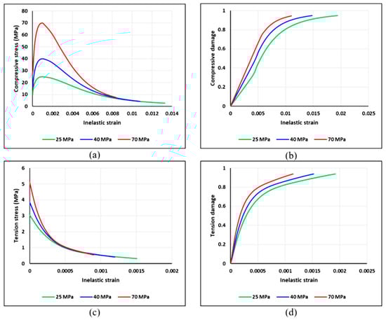 Definition of concrete damage–plasticity model parameters in ABAQUS: (a) compressive stress vs. inelastic strain, (b) compressive damage vs. inelastic strain, (c) tensile stress vs. cracking strain, and (d) tensile damage vs. cracking strain.