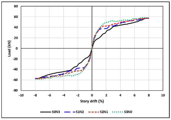 Numerical beam tip-load versus story drift envelopes of the C25-A0-S3N0, C25-A0-S1N2, C25-A0-S2N1, and C25-A0-S0N3 specimens.
