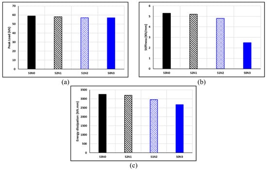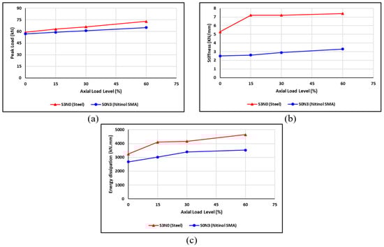 Effect of axial load level of the BCJ on (a) load capacity, (b) stiffness, and (c) energy dissipation.