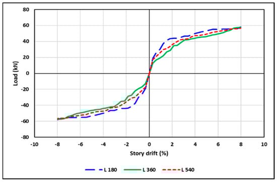 Numerical beam tip-load versus story drift envelopes of the specimens C25-A0-S0N3, C25-A0-S0N3-L180 and C25-A0-S0N3-L540.