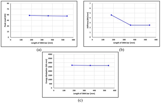 Effect of SMA bar length of the BCJ on (a) load capacity, (b) stiffness, and (c) energy dissipation.