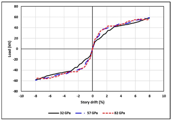 Numerical beam tip-load versus story drift envelope of the specimens C25-A0-S0N3, C25-A0-S0N3-E57 and C25-A0-S0N3-E82.