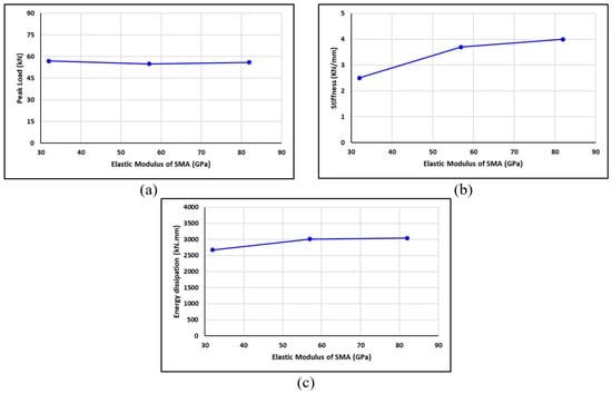 Effect of SMA elastic modulus of the BCJ on (a) load capacity, (b) stiffness, and (c) energy dissipation.