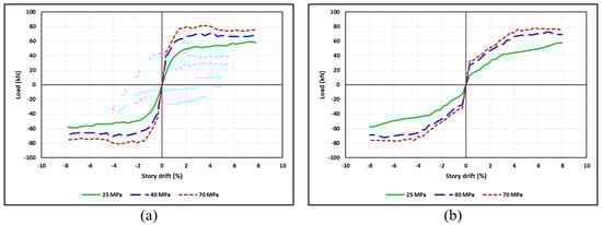 Numerical beam tip-load versus story drift envelopes of the specimens (a) C25-A0-S3N0, C40-A0-S3N0 and C70-A0-S3N0 (b) C25-A0-S0N3, C40-A0-S0N3 and C70-A0-S0N3.