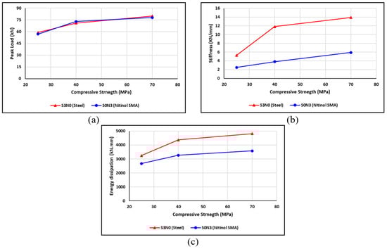 Effect of compressive strength of concrete of the BCJ on (a) load capacity, (b) stiffness, and (c) energy dissipation.