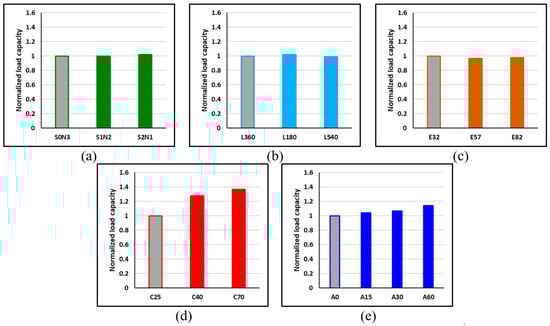 Comparisons of the effect of SMA on load capacity of the BCJ for the (a) SMA–steel reinforcement ratio, (b) lengths of SMA bars, (c) elastic modulus of SMA, (d) compressive strength of concrete, and (e) axial load level.