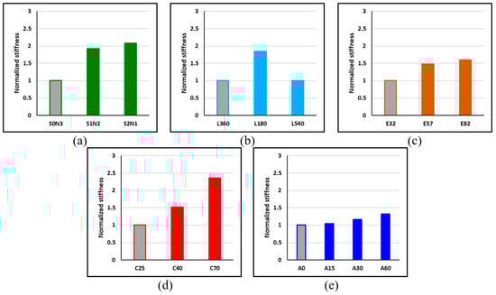 Comparisons of the effect of SMA on stiffness of the BCJ for the (a) SMA–steel reinforcement ratio, (b) lengths of SMA, (c) elastic modulus of elasticity of SMA, (d) compressive strength of concrete, and (e) axial load level.