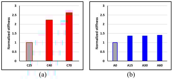 Comparisons of the effect of steel rebars on stiffness of BCJ for: (a) concrete strength; (b) axial load level.