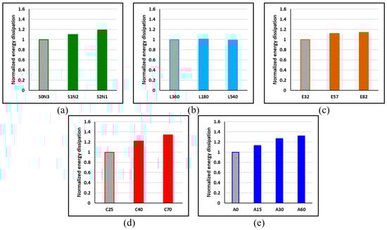 Comparisons of the effect of SMA on energy dissipation of the BCJ for the (a) SMA–steel reinforcement ratio, (b) lengths of SMA, (c) elastic modulus of SMA, (d) compressive strength of concrete, and (e) axial load level.
