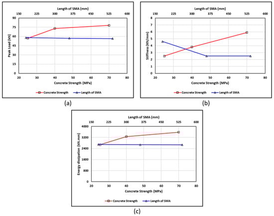 Comparisons of the effect of the length of SMA and concrete strength parameters on the BCJ for: (a) peak load, (b) stiffness, and (c) energy dissipation.