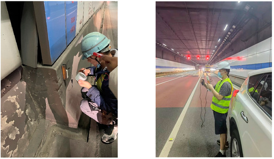 A large amount of recorded data on air velocity and temperature was retrieved and processed through cooperation with the management company of the Shanghai Yangtze River Tunnel. The company stated that the sensors (temperature, air velocity, etc.) near the upstream exit of the tunnel were regularly calibrated, and the data were reliable. Then, the actual measurements of the internal environmental parameters of the Shanghai Yangtze River Tunnel include winter and summer testing. The winter testing was conducted from 23:00 on 23 February 2022, to 1:00 on 24 February 2022, and the summer testing was conducted from 23:00 on 12 July 2022, to 2:00 on 13 July 2022. During the tunnel testing process, two out of three lanes were open for normal traffic while the tunnel operator provided us with a roller compactor to close off one lane for testing. The traffic flow inside the tunnel was not affected at that time. 21 measuring points were arranged longitudinally along the tunnel, mainly in areas such as emergency and connecting passages that were convenient for fixing instruments (the on-site measurement photos are shown as in Figure 2). The wall temperature of the tunnel was measured using an infrared thermometer (model FLIR TG65, accuracy ±1.5 °C, resolution 0.1 °C, measurement range −25–380 °C) at each measuring point. The air velocity was measured using a hot wire anemometer (model WFWZY-1, accuracy ±0.05 m/s, resolution 0.01 m/s, measurement range 0.05–30 m/s), and the temperature and humidity were measured using an temperature and humidity meter (temperature accuracy 1%, temperature resolution 0.1 °C, measurement range −40–100 °C; humidity accuracy 3 RH, humidity resolution 0.1 RH, measurement range 0–100% RH). A temperature data logger (model WZY-1, accuracy ±0.3 °C, resolution 0.1 °C, measurement range −20–80 °C) was installed to record the air temperature at each measuring point for a period of time (the instruments used for winter testing were retrieved on June 9, and those used for summer testing were retrieved on 1 August). The outdoor temperature, humidity, and air velocity on the day of the actual measurements were obtained directly from on-site measurements, and the outdoor temperature data corresponding to the temperature data logger were obtained by retrieving temperature data from two meteorological stations near the entrance and exit of the tunnel.