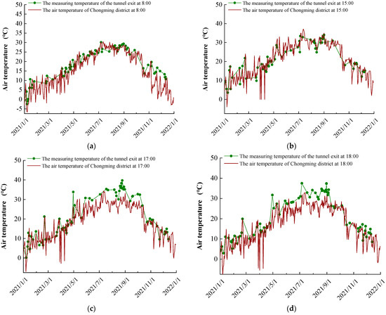 When comparing and analyzing the daily hourly temperatures in Chongming district that year, it was found in Figure 3a that the temperature difference between the temperature at 8 am in the summer and the tunnel temperature was relatively small. This is because the tunnel air temperature in the summer is affected by the heat exchange of the lining, the external temperature, and the heat dissipation of the cars. The lining directly exchanges heat with the soil at a lower temperature in the Yangtze River, resulting in a lower temperature in the tunnel air, which leads to a certain degree of temperature drop. At the same time, the temperature at 8:00 is generally 2–3 °C lower than the average temperature of the day, so the temperature at the tunnel exit is relatively close to the temperature in Chongming district in the summer at 8:00. After entering the winter season, the temperature at the tunnel exit during this time period is significantly higher than the temperature in Chongming district. This is because the tunnel has a thermal insulation effect in the winter, and the heat dissipation from the cars in morning rush gradually converges towards the tunnel exit due to the effects of traffic and natural wind, forming a heat accumulation zone near the exit, which raises the air temperature. At the same time, due to the low temperature at 8:00, the temperature difference between the two is even more obvious. From Figure 3b, it can be seen that the temperature at the tunnel exit at 15:00 is relatively close to the temperature in Chongming district, and the temperature difference between the two in the winter at 8 am is smaller than in the afternoon at 15:00. This is because the traffic volume is smaller in the afternoon (before 17:00), and the tunnel heat accumulation caused by car heat dissipation is not significant, so the temperature at the tunnel exit rises limitedly. In addition, the temperature at 3 pm usually corresponds to the highest temperature of the day, so the temperature difference between the tunnel exit and the temperature in Chongming district is relatively small during this period. From Figure 3,d, it can be seen that 17:00 and 18:00 is the peak period of traffic volume in the evening rush hour, and there is a large amount of car heat dissipation, leading to a significant heat accumulation effect at the tunnel exit, especially in the winter and summer seasons. Therefore, the temperature at the tunnel exit at 17:00 to 18:00 is about 3–8 °C higher than the temperature in Chongming district, and the temperature difference is greater in summer than in winter.