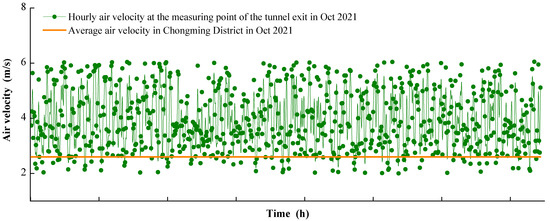 Hourly data for air velocity monitoring at the tunnel exit and in Chongming district during October 2021.