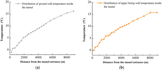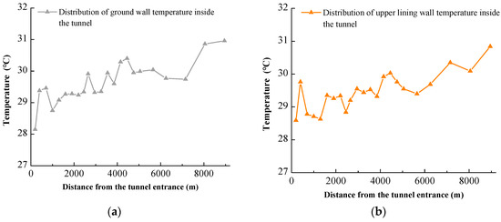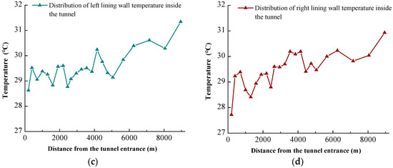 The statistical results of the wall temperature test in summer are shown in the Figure 8. In summer, the temperature of the walls on both sides of the tunnel section is about 1–2 °C lower than the air temperature inside the tunnel. From the entrance to the exit, the temperature of each wall gradually increases, but the increase is only around 3 °C. The temperature rise inside the tunnel is not significant, and in some points along the tunnel, there are even cases of temperature decrease. This is because the tunnel lining directly exchanges heat with the surrounding soil and water, forming a natural cold source that continues to cool the tunnel. It can be predicted that when the traffic volume increases, especially in traffic jams, the temperature rise along the tunnel will further increase. If the outdoor temperature in summer exceeds 35 °C, the tunnel’s heat accumulation effect may cause the temperature near the exit of the tunnel to exceed the limit of 40 °C.