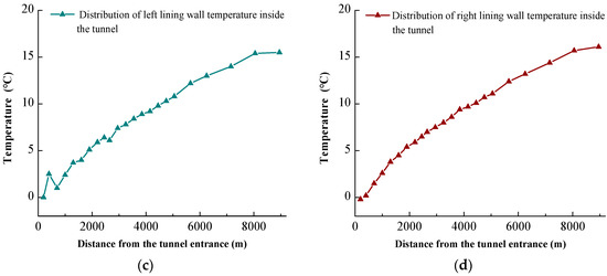In winter, the temperature distribution of all tested walls of the tunnel section is similar, with the temperature increasing from 0 °C at the tunnel entrance to about 15 °C at the exit. The temperature rise near the exit tends to level off, while in the middle section of the tunnel, the temperature rises almost linearly. At the same time, the wall temperature in winter is slightly lower than the air temperature, indicating that the lining of the tunnel has a good insulation effect on the tunnel. The heat emitted by the cars during the driving process has evenly heated the tunnel, and some of the heat is brought to the back half of the tunnel by the traffic ventilation, making the overall temperature rise of the tunnel walls more significant.