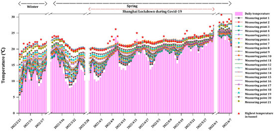 On 23 February 2022, we deployed 21 temperature data loggers in the Shanghai Yangtze River Tunnel. Due to the city’s lockdown during the COVID-19 outbreak in 2022, the instruments were retrieved on June 9 when they still had power. Firstly, we organized the data from February 23 to June 8. As the data logger recorded the temperature every 10 min, we calculated the daily average temperature of each measurement point for ease of graphical analysis. We also kept track of the highest temperature recorded at each measurement point on the same day. Based on Figure 9, it can be observed that the cumulative temperature effect inside the tunnel decreases as the outdoor temperature increases. During winter, the temperature rise from the entrance to the exit of the tunnel can reach up to 12 °C, while in spring, it is generally reduced to below 5 °C, with some days having a temperature rise of only 2–3 °C. It was also found that the temperature inside the tunnel in winter is significantly higher than the daily average temperature in the Chongming District. However, in spring, the temperature inside the tunnel at sometimes is even lower than the outside air temperature, indicating that the tunnel has a thermal insulation effect in winter. After spring and summer, the heat exchange between the tunnel enclosure structure and the outside water and soil reduces the temperature of the inner wall of the tunnel, indirectly lowering the air temperature inside the tunnel. Additionally, Figure 9 shows that during the period of epidemic prevention and control, the temperature rise along the tunnel decreased to some extent. This was due to the gradual increase in temperature on the one hand, and the decrease in traffic flow and heat dissipation from vehicles caused by the control measures on the other hand, resulting in a less obvious temperature rise along the tunnel caused by the heat dissipation of vehicles and traffic ventilation effect.
