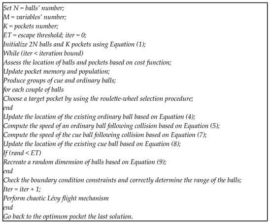 This algorithm’s design is based on the billiards game. Resolution variables are surrounded by each solution, considered to be balls with various dimensions. Balls are assumed to be factors in the optimization problem, and as dimensions of balls, variables are taken into account. Thus, the balls are first generated and located in various places randomly and the best one is assumed to be the pocket. Next, the balls are divided into two groups, cue balls and ordinary balls. The balls are directed by cue balls into the pockets. After the collision, based on the kinematics and collision rules, the movement direction of balls and their position is set. The Billiard-based Optimization Algorithm (BOA) steps are defined in the following: