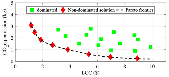 The minimization of the CO2-eq emissions and the life-cycle costs is the target in this paper. Residential buildings are assumed to be studied herein. Indeed, the considered objectives are conflicting. High-energy-efficiency materials may have less environmental benefit than low-energy-efficiency ones, while the cost of materials that benefits the environment is often more than the same customary materials. Consequently, a multiple-objective optimization (MOO) [32] technique is required. A Pareto frontier is required to help the decision maker to quickly evaluate the balance between the two objectives. A Pareto optimum is a solution to the MOO problem that lowers an objective with no simultaneous effect on the other objective. The Pareto frontier is the plot of the objective function in which its non-dominated vectors are in the Pareto optimum set that is non-dominated. A Pareto frontier [33] whose objectives are LCC and carbon dioxide emissions is depicted in Figure 3 as an example.