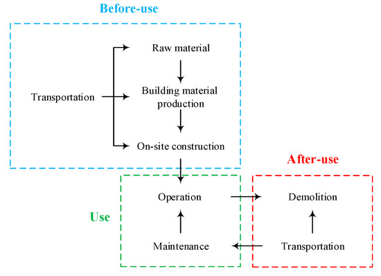 Figure 4 shows all the steps of a building’s lifetime in the life-cycle evaluation of residential buildings. These steps are the before-use step, which includes extracting raw materials and processing them, producing components for construction, transporting the materials, and constructing the building; the use step, which consists of all emissions in 25 years of the building‘s life use, concerning the building maintenance in addition to the utilized energy for cooling, heating, lighting, and equipment; and the after-use step, which includes the building demolition and then transferring waste.