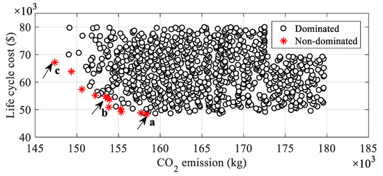 The results of the optimization method are provided in this section. It took 90 s for each simulation on average on the defined system. The Pareto frontier solution of carbon dioxide emissions and life-cycle costs is depicted in Figure 7.