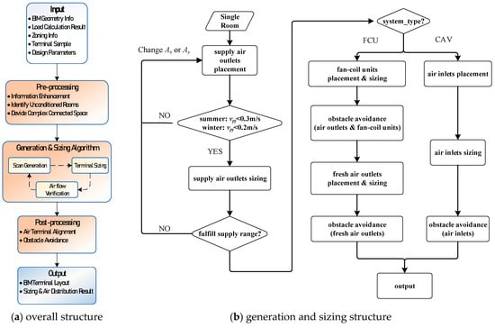 In this section, this paper will introduce the overall structure of the algorithm, as shown in Figure 1. In the entire HVAC design process, the task of layout and sizing of terminals is an intermediate task that follows the calculation of building energy consumption and is closely followed by the layout of air ducts and water pipes. Therefore, it is necessary to define the input and output of the algorithm to a certain extent, as given in Table 1: