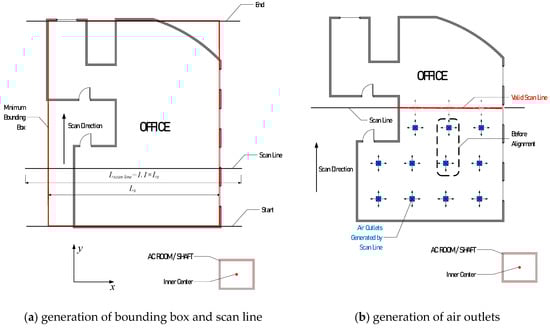 The scanning step and placement of air outlets are carried out in two steps. The air supply outlets are defined based on the minimum bounding box of the room and the scanning direction determined earlier. The starting position of the scan line is determined by the minimum coordinate value of the room in the minimum bounding box along the axis of the scanning direction, while the ending position of the scan line is determined by its maximum coordinate value, as shown in Figure 2a. For example, Figure 2b corresponds to the scenario shown in Figure 3g.