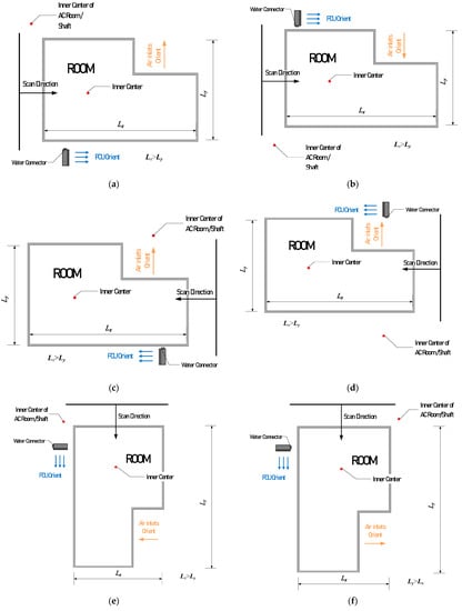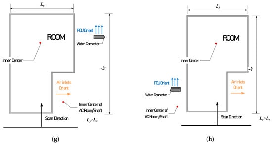 Based on the above parameters, this paper distinguishes eight (4 × 2) basic scenarios by the relative position relationship between Point (xplant room, yplant room, zplant room) and Point (xroom, yroom, zroom), and the factor of Lx/Ly, as shown in Figure 3. For example, Figure 3a represents the scenario where Lx/Ly < 1 and the air-conditioning room is located in the upper left corner of the room to be arranged. In this situation, the air duct design often needs to extend from the air-conditioning room through corridors or adjacent rooms into the room to be arranged, with the aim of reducing the resistance of the air duct and considering the economy of the pipeline construction. Therefore, the air duct is likely to enter from the left or upper wall. If Lx > Ly, the scan lines can obtain more stable results with more default spacing by scanning parallel to the longer y-axis direction. Additionally, when the spacing distance Ay is adjusted, the scan lines scanned in the y-axis direction can accommodate larger-scale spacing distance adjustments. In the arrangement of the return air inlet in the CAV system, placing it on the long side means higher stability of airflow organization and can also offset the air supply and return pipes to reduce collision.