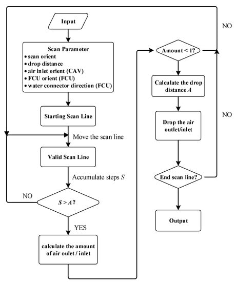 In Section 3.1, this paper defines the “scan line” and the parameters related to the scenario classification mentioned earlier, and the eight scenarios derived from them will also be presented and explained. Section 3.2 shows how the scan line generates supply, return, and fresh air outlets, respectively. Section 3.3 introduces how the algorithm performs airflow organization verification and outlet sizing based on the initial scanning results to ensure that the automatically generated outlet layout can meet the airflow organization requirements of conventional design. Section 3.4 provides a detailed description of the layout and sizing of FCU outlets.