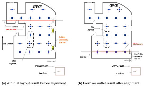 The positioning of FCU depends on the previously arranged air outlets. However, due to the fluctuation of the irregular room boundary, adjacent air outlets may not be aligned properly, as shown in Figure 2b. To address this issue, the algorithm needs to determine the specific direction for aligning the air outlets based on the previously determined FCU orientation. For instance, in Figure 2b, the FCU orientation is (0,1). Therefore, air diffusers with x-coordinates that are not equal but close within a certain threshold need to be aligned. If the FCU orientation is along the x-axis, air diffusers with a y-value difference of less than 0.1 m are considered to be in the same row. If the FCU orientation is along the y-axis, air diffusers with an x-value difference of less than 0.1 m are considered to be in the same column. After aligning the air diffusers, the few diffusers that deviate from the alignment are adjusted to have the same y-value or x-value, resulting in an aligned layout, as shown in Figure 5b.