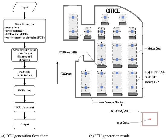 For FCU systems, the necessary terminals to be added are the FCU terminals and fresh air outlets. Before determining the exact location of the FCU terminal, there is a question of how to assign the already placed supply air outlets to the FCU terminal to be placed. The placement of the FCU terminal also needs to consider the orientation and the direction of the water pipe connector of the sized FCU terminal. Moreover, since there is an inevitable connection (duct) between the FCU terminal and the air outlets, the algorithm needs to consider not only the obstacle avoidance for each individual terminal but also the potential collisions between the system formed by the FCU and the air outlets and the room edges or columns. Finally, the algorithm needs to perform placement and sizing with obstacle avoidance for a small number of fresh air inlets.