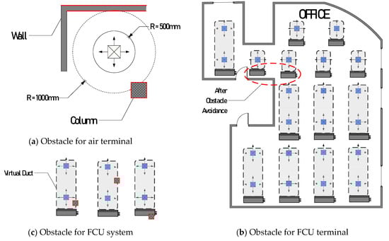 For the placement of air outlets, it is important to avoid obstacles such as room boundaries and columns during terminal placement tasks. Failure to do so can lead to wasted resources, decreased efficiency, and other issues during construction. The algorithm considers obstacles for individual terminals and the duct between the FCU and air outlets. As shown in Figure 7a, if an obstacle is present within a 1000 mm radius of an air vent, the algorithm will attempt to move it up to 500 mm in the x and y directions until it no longer collides with obstacles. If no suitable position is found, the air outlet will be deleted (and re-size the remaining air outlets). The air inlet will be highlighted as problematic, and the fresh air outlet will be kept for air intake only, which takes about 10% of the air volume in a room. If a room does not have an air outlet due to the narrow width and obstacle avoidance, the algorithm will not add new ones for there is no point to place an air inlet. The FCU has its own position threshold and will not collide with air outlets. In Figure 7b, collisions mainly occur with room boundaries, detected within a 500 mm radius by the algorithm. If a collision is detected, the FCU will be moved to a new position in its current orientation until it satisfies the 500 mm threshold.