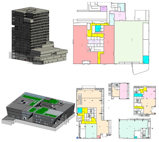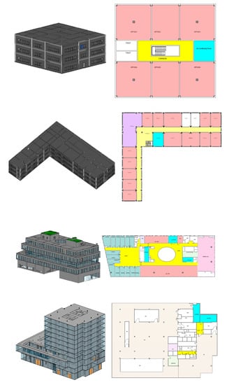 Figure 8 shows six different office buildings with varying geometry and features, which were used in this study to validate the practicality of the algorithm. A BIM-BEM tool was developed to convert gbxml files from Revit into idf files and conduct annual energy calculations using Energyplus. Various samples of terminals were selected from a family library for reference in the sizing process, which was carried out in a Python environment and saved as a json file. Finally, the results were imported into Revit using the official API for secondary development for visualization.