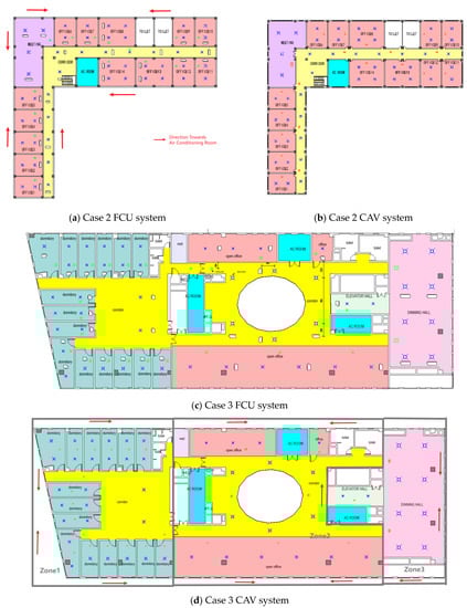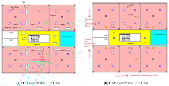 Figure 9 depicts the building plan of Case 1, which was a demonstration conducted in the early stage of our research. The building has a total area of 2184 m2 and three floors, with this standard floor located on the third level. The layout design is neat and the terminal orientation trend is very clear. In Figure 9a, the fan coil units located on the left and right sides of the building plan are arranged on the left and right sides of the rooms, respectively. The orientation and relative position of the partitioned air-conditioning room/shaft are automatically determined to facilitate the connection of the supply/return pipes extending from the AC room/shaft. Similarly, the fresh air outlet in Figure 9a and the return air inlet in Figure 9b only need to be placed near the room edge to meet the indoor fresh air demand, because the proper placement of the air outlet near the room edge can reduce the total investment in duct material. The centrally located complex interconnecting corridor does not have a terminal placement on the upper and lower sides due to the narrow width, so the load of the corridor is transferred to the two air outlets on the wider corridors on the left and right sides, making these two air outlets appear larger. In the OFFICE1 and CORRIDOR rooms, the FCUs are sized based on the load and air volume assigned to the respective air outlets. Therefore, in OFFICE1, the sized FCU is a terminal unit with a rated cooling capacity of 11 kW, while in CORRIDOR, the selected FCU has a rated cooling capacity of 8 kW. The partial information of the sizing result is listed in Table 4.