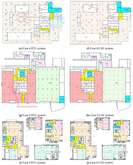 The remaining five cases, shown in Figure 10, demonstrate the ability and the robustness of the algorithm to successfully arrange FCU and CAV systems in rooms of various shapes.