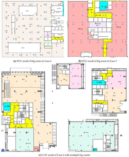 Case 6 (Figure 12c) is the most complex and largest building among all the tested structures, containing multiple blocks and AC rooms. It encompasses most of the irregular and large room scenarios discussed earlier. It is worth noting that since the air supply method studied in this paper is a ceiling-mounted diffuser system, we chose to validate the algorithm’s performance in rooms such as “HALL” using diffusers rather than the more commonly used lateral supply air outlet. Based on the validation results of the six buildings, we conclude that the proposed algorithm is highly robust and can support the design of air supply terminals for almost all building configurations, providing a specific layout and sizing plan.