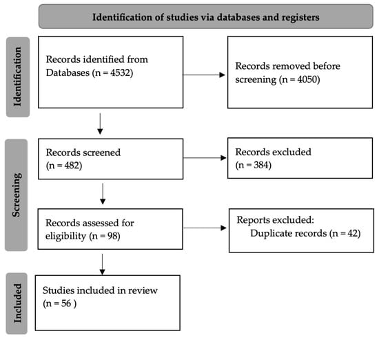 Considering the above inclusion criteria (Table 2), 4532 records were identified in the first step, of which 4050 records that were not accessible in the full-text version were removed. The initial screening excluded 384 records that were not directly related to our review. After this screening, 98 records were reviewed for eligibility. The second screening excluded 42 duplicate records. Finally, 56 records met our selection criteria and were further discussed in Section 3 and Section 4 of the current study (Table 1, Figure 1).