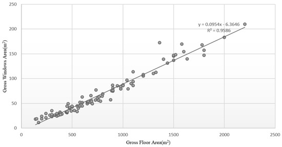 Based on the results of the analysis in Section 4.2, the indoor temperature and outdoor temperature were found to directly affect heat consumption, so they can directly participate in modeling. The gross floor area and gross window area are both “area” factors, so a strong correlation judgment is required to determine whether these two factors can participate in modeling. The correlation between GWA and GFA is shown in Figure 2.