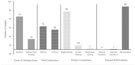 Other important factors include the forms of heating systems, wall construction, window construction, and exterior wall insulation. The survey results for the above four factors regarding the one hundred buildings chosen for investigation and testing are shown in Figure 3.