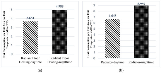Figure 4a,b show that there was a large gap in heat consumption per unit per temperature between daytime and nighttime. The data during the daytime were significantly lower than those of nighttime. The deviation in radiant floor heating systems was 26.1%, and the deviation in radiator systems was 25.8%. Therefore, daytime and nighttime should also be considered in the model.