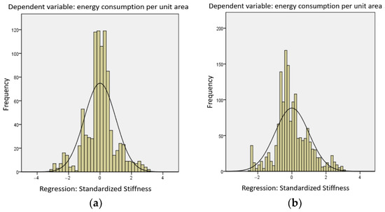 In the process of modeling, we found that the effect of the model was poor. It could not pass the t-test or F-test, and the adjusted R2 value was much less than one. Thus, the data characteristics of daytime and nighttime were further analyzed. The effects of different forms of heating systems are shown in Figure 4a,b.