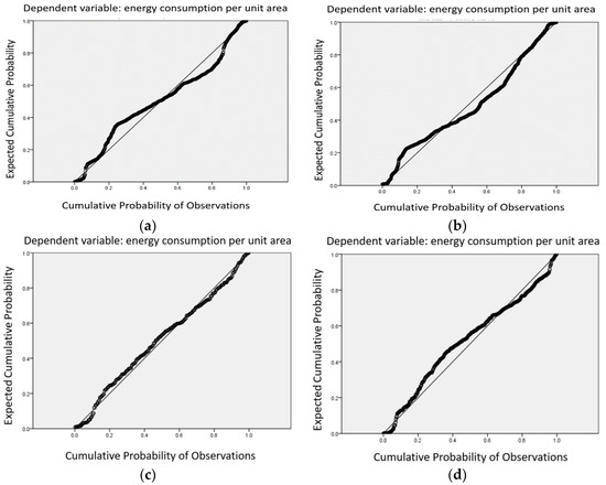 Model P-P plot: (a) Radiator—Daytime; (b) Radiator—Nighttime; (c) Radiant Floor Heating—Daytime; (d) Radiant Floor Heating—Nighttime.