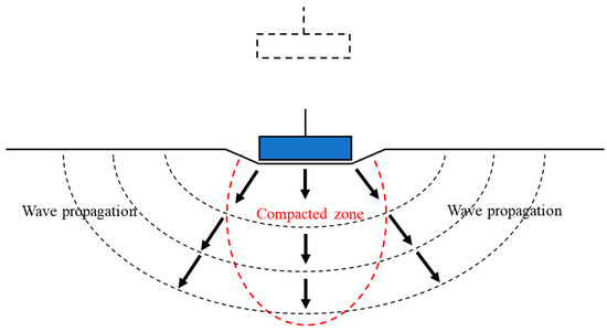 Dynamic compaction, which involves the repeated tamping of soil with a pounder, improves the soft ground beneath the tamping point. This method generates excess pore water pressure (EPP) and volume waves, including transverse, longitudinal, and surface waves, as illustrated in Figure 1 [16]. In particular, the generation and dissipation of excessive pore water pressure is related to soil consolidation [17].