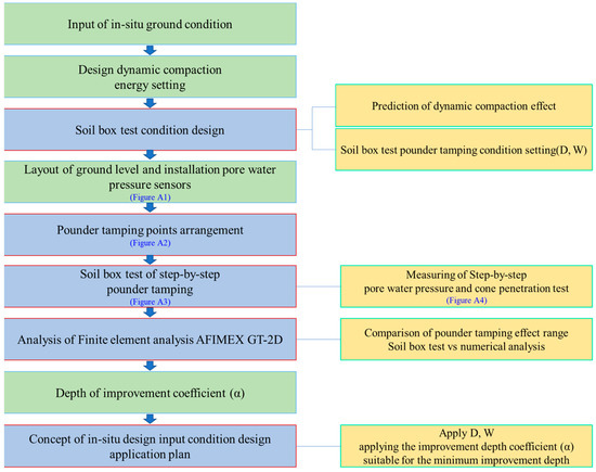 The method proposed in this study can be economically applied for ground improvement within a short period. When considering the effect of ground improvement through dynamic compaction, the depth of improvement, tamping energy, spacing of tamping points, and number of tamping repetitions must be considered. However, the soil box test in this study did not allow for a comprehensive consideration of tamping point spacing and pounder tamping height due to the challenges posed by repetitive testing. Therefore, further studies should be conducted to address these aspects.