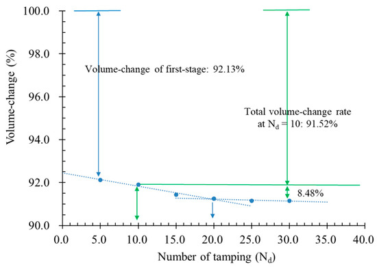 The volume change before and after the construction of the dynamic compaction pounder was measured at each stage of tamping. The volume change of the ground due to step-by-step dynamic compaction was measured using a level at the pounder tamping point. Notably, changes in the height and ground volume decreased with the number of pounder tamping repetitions. The differences were validated by the settlement heights of each tamping stage based on the initial ground height. The change in settlement and ground volume caused by pounder tamping decreased as the number of tamping increased (Figure 4). The step-by-step volume change attributed to the pounder tamping was 7.87%, 8.09%, 8.56%, 8.75%, 8.84%, and 8.84%. The largest volume change, a decrease of 5.47%, was observed in step three (Nd = 15), as it converged from step four (Nd = 20). Menard and Broise (1975) reported that the minimum number of tamping can be determined when the increase in settlement due to dynamic compaction is less than 10% of the total settlement [24]. In this study, the settlement in step two (Nd = 10) was 8.48% of the total settlement. However, as the settlement converged after step three (Nd = 15), the minimum number of tamping is recommended to be set at 15.