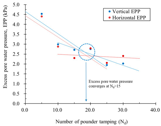 The change in excess pore water pressure of the ground caused by the step-by-step of pounder tamping increase in Ev was measured. In particular, the excess pore water pressure decreased in both the vertical and horizontal directions with stepwise increments in the Ev. The excess pore water pressure in vertical and horizontal directions is shown in Figure 5. The average EPP for each stage was 4.40 kPa in the vertical direction and 4.54 kPa in the horizontal direction in step one, 2.88 kPa in the vertical direction and 2.99 kPa in the horizontal direction in step two, 2.30 kPa in the vertical direction and 2.72 kPa in the horizontal direction in step three, 2.79 kPa in the vertical direction and 2.75 kPa in the horizontal direction in step four, 2.05 kPa in the vertical direction and 1.95 kPa in the horizontal direction in step five, and 2.41 kPa in the vertical direction and 2.03 kPa in the horizontal direction in step six. As for the vertical and horizontal EPP, the EPP decreased as the number of pounder tamping repetitions increased. Xu and Hu (2017) reported similar results, essentially indicating that the EPP induced by dynamic compaction decreases with an increase in compaction energy and depth [25]. This finding implies that the strength of the ground increases owing to step-by-step dynamic compaction. In addition, it converges at the pounder tamping step three (Nd = 15) or at higher steps. Moreover, the effect of dynamic compaction was up to 4.0 m in the vertical direction and 3.0 m in the horizontal direction. These results demonstrate that the ground was efficiently improved by performing step-by-step dynamic compaction wherein tamping was performed alternately according to the diameter of the pounder. Bonab and Zare (2014) also analyzed the effect of tamping space and pattern on dynamic compaction, and thereby revealed that the ground improvement is enhanced by alternately performing tamping patterns at adjacent points, which is consistent with our results [26]. Essentially, dynamic compaction is effective for ground improvement in all directions.