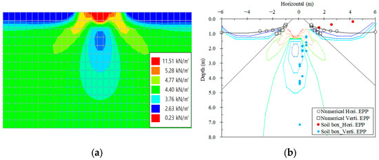 Changes in excess pore water pressure by numerical analysis: (a) excess pore water pressure range in numerical analysis; (b) comparison of EPP of numerical analysis and soil box.