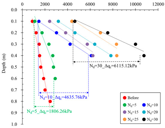Figure 8 presents the results of the static cone penetration test after dynamic compaction. The static cone penetration test was able to measure up to a depth of 0.8 m of ground of the soil box before dynamic compaction. However, as the step-by-step dynamic compaction test progressed, the measurements were limited to a depth of 0.4 m. Presumably, this limitation occurred because the relative density increased as the dynamic compaction Ev in each step was transmitted to the lower part of the ground. As illustrated in Figure 8, the effect of ground improvement was not significant until step one (Nd = 5) compared with static cone penetration resistance before dynamic compaction. Starting from step two (Nd = 10), the static cone penetration resistance increased with the compaction depth. The difference in static cone penetration resistance by depth was 1806.26 kPa in step one (Nd = 5), whereas it increased by a factor of 2.93 to a pressure of 4635.76 kPa in step two (Nd = 10), and by a factor of 3.87 to 6115.12 kPa in step six (Nd = 30). The static cone penetration resistance at the ground surface increased by a factor of 1.33 in step two (Nd = 10); however, the highest increase in its value (by a factor of 1.65) occurred in step three (Nd = 15). These findings suggest that a minimum of 15 tamping repetitions (Nd = 15) is required for ground strength improvement through dynamic compaction.