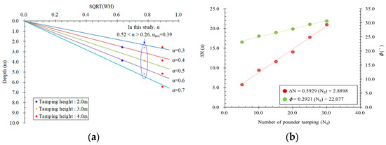In this study, the α for the soil box test was in the range of 0.26–0.52 (Figure 9a). The depth of improvement coefficients of previous researchers is summarized in Table 3. Compared with previous studies, the depth of improvement coefficient in this study exhibited a slightly lower range of values. However, domestic researchers, Jang et al. (2009) [27] and Lee and Kim (1996) [28], reported a range of values similar to the depth of improvement coefficient. The variation in the improvement depth coefficient may be attributed to differences in soil formation history by region, soil type, and empirical correlation data.